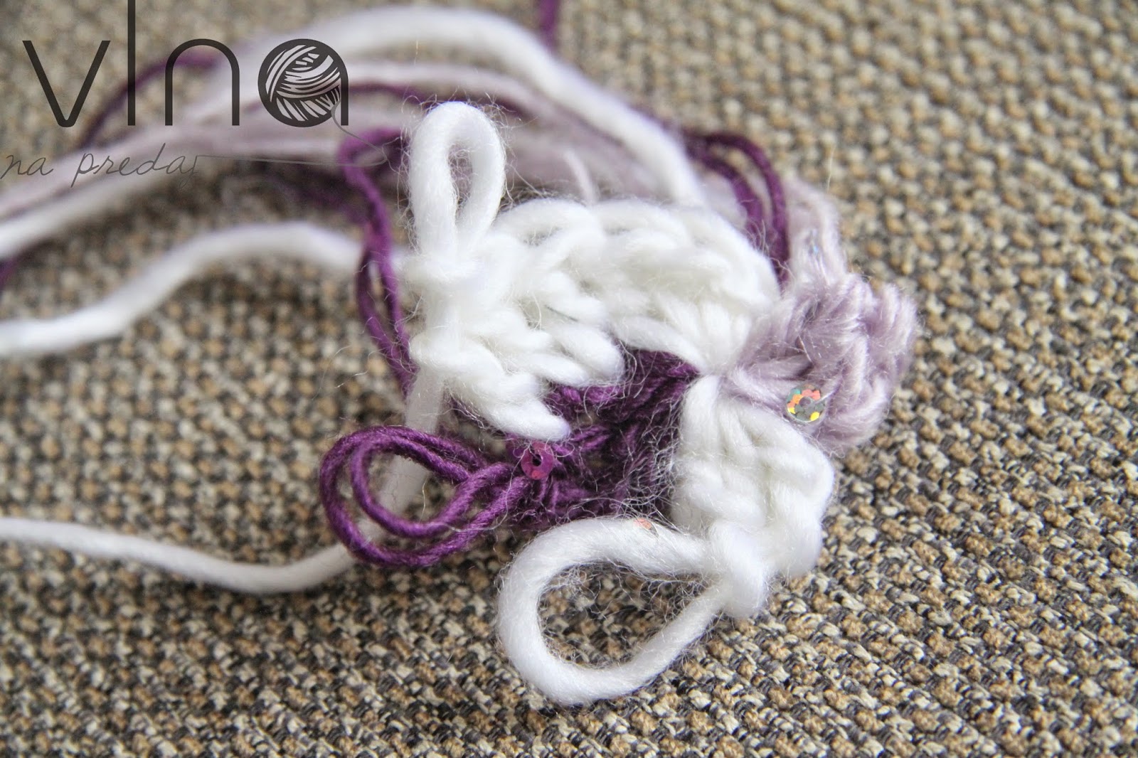 Keď som skončila všetky tri riadky, nechala som dlhšie konce. Ešte som si odstrihla z vlny a pridala som to k nim, aby bol vrkôčik hrubší.